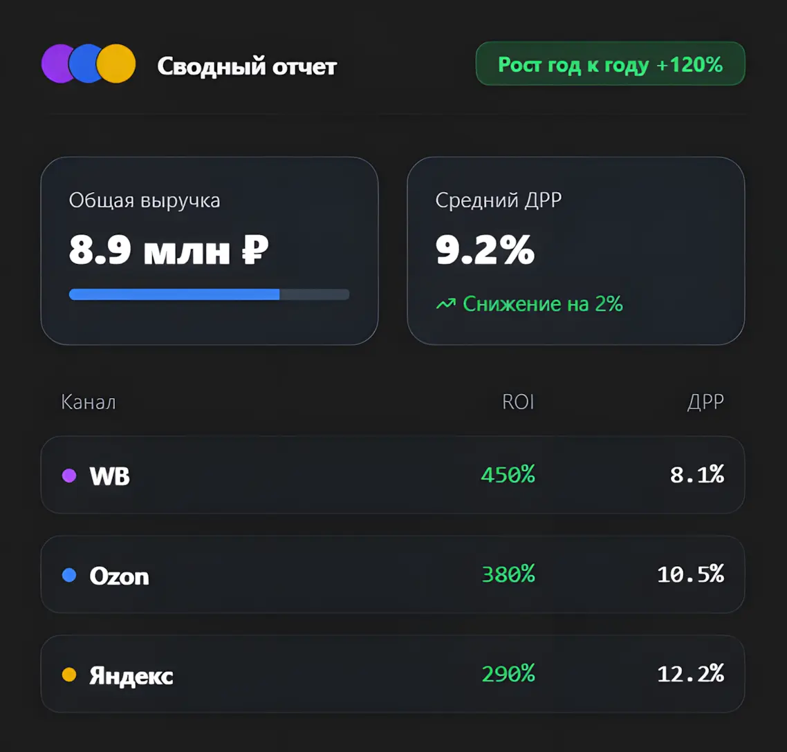 Единая стратегия для WB, Ozon и Яндекс.Маркета. Подключаем внешний трафик из Яндекс.Директ и соцсетей. Максимизируем прибыль, а не просто клики.