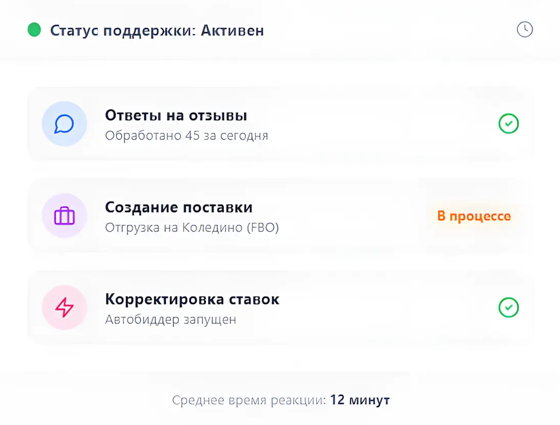 Возьмем на себя всю рутину: от ответов на отзывы и создания поставок до SEO-оптимизации и управления рекламой. Вы занимаетесь развитием продукта, мы — продажами.