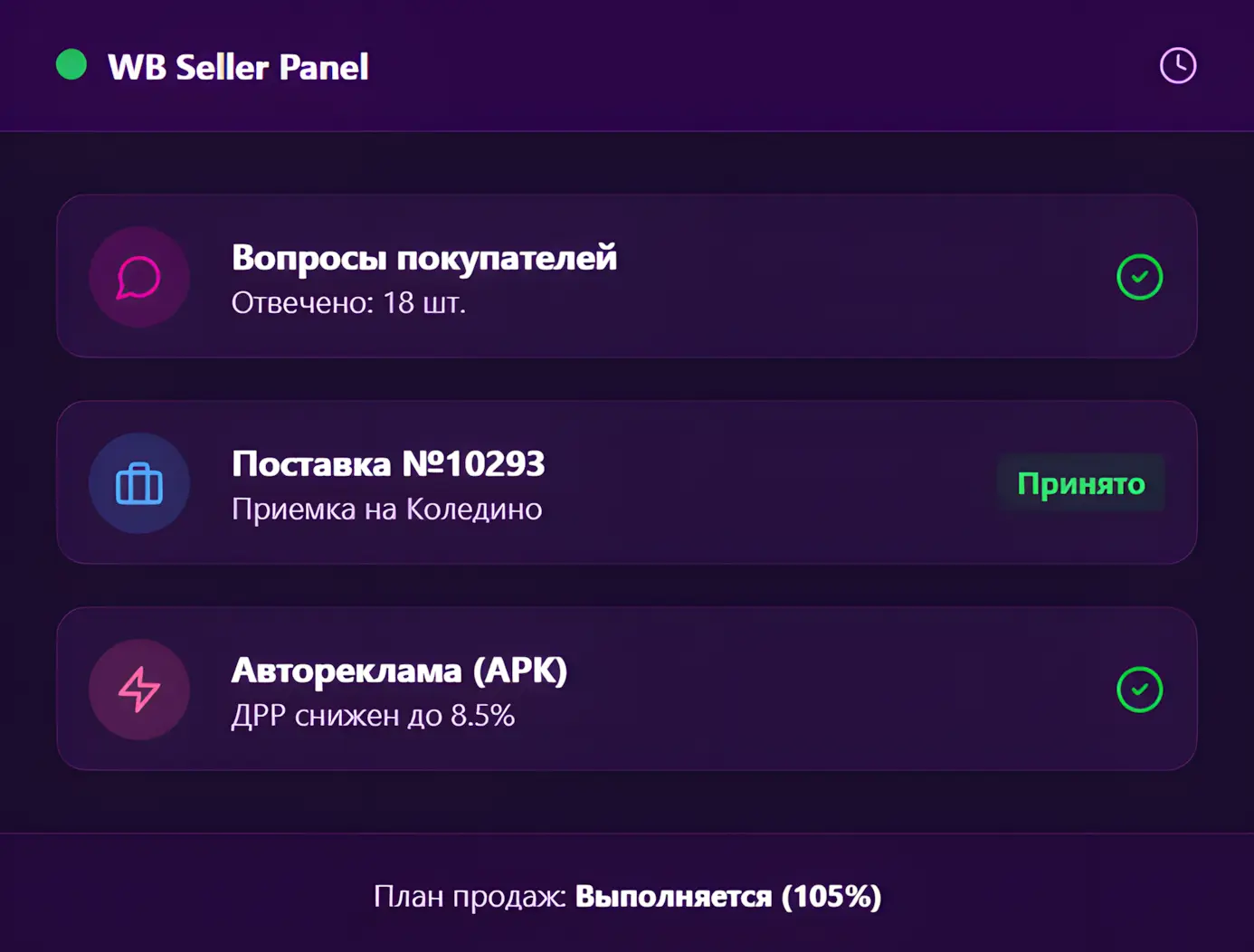 Wildberries — динамичная площадка, где правила меняются еженедельно. Менеджер на сопровождении берет на себя рутину: следит за остатками, чтобы карточки не вылетели из ранжирования, корректирует SEO под сезонные запросы и, самое главное, управляет рекламным бюджетом через автобиддеры, не давая слить деньги. В рамках услуги мы также контролируем Unit-экономику каждой акции. Прежде чем вступить в распродажу, мы считаем маржинальность, чтобы вы торговали в плюс, а не рад и оборота.